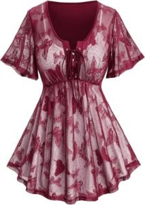 Rosegal Plus Size Women’s V-Neck Butterfly Lace Overlay Lace-Up 2-in-1 Blouse – A Flowy, Feminine Statement Piece for Every Occasion