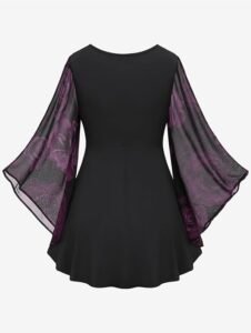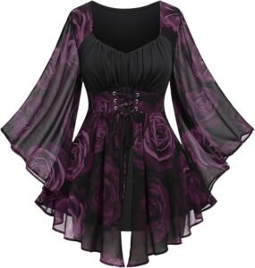 Unleash your inner dark queen with the Rosegal Women Plus Size Romantic Gothic Lace-Up Bell Sleeves Tee, a striking fusion of vintage beauty, gothic allure, and renaissance-inspired fashion. Perfect for those who adore unique, statement-making style, this top brings together drama, romance, and sophistication — creating a look that’s both enchanting and unforgettable. Whether you’re dressing up for a costume event, attending a gothic festival, or simply adding a bold touch to your everyday wardrobe, this top will make you feel powerful, confident, and undeniably captivating.